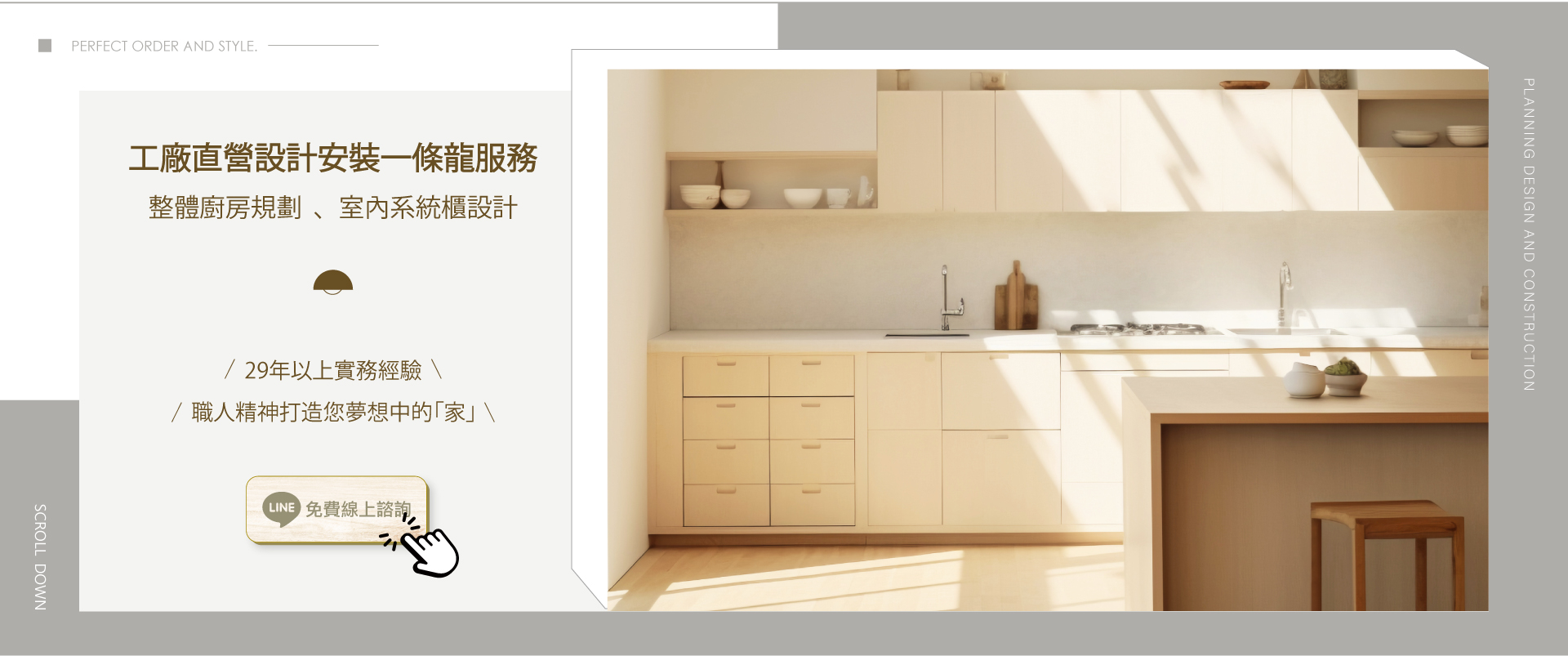 以設計圖及展示間樣品解說設計及搭配的內容,決定配色風格,打造心中理想的廚房。