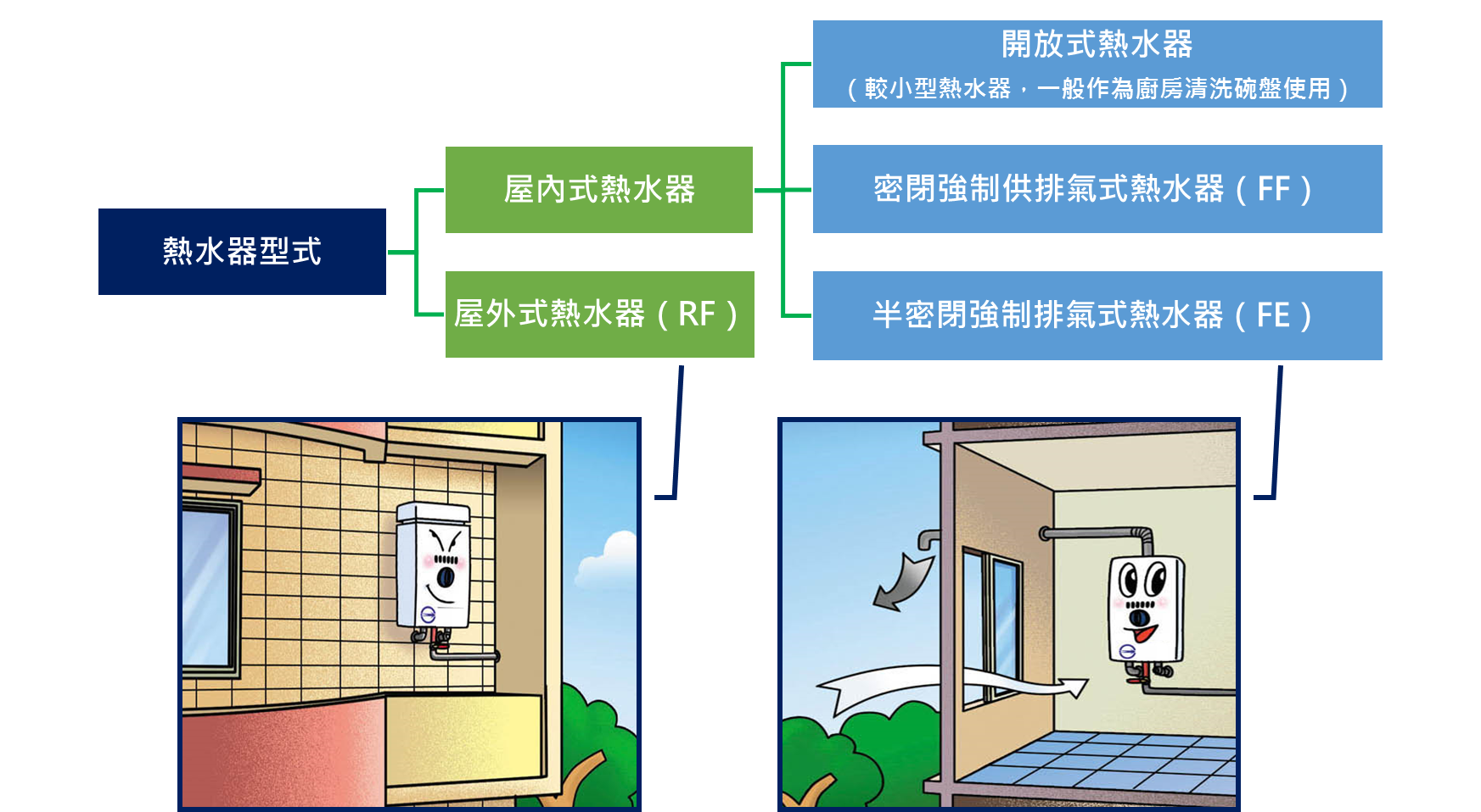 熱水器分為屋外式熱水器(RF)及屋內式熱水器,屋內式熱水器又有開放式熱水器(較小型熱水器,一般作為廚房清洗碗盤使用)、密閉強制供排氣式熱水器(FF)及半密閉強制排氣式熱水器(FE)的分別。