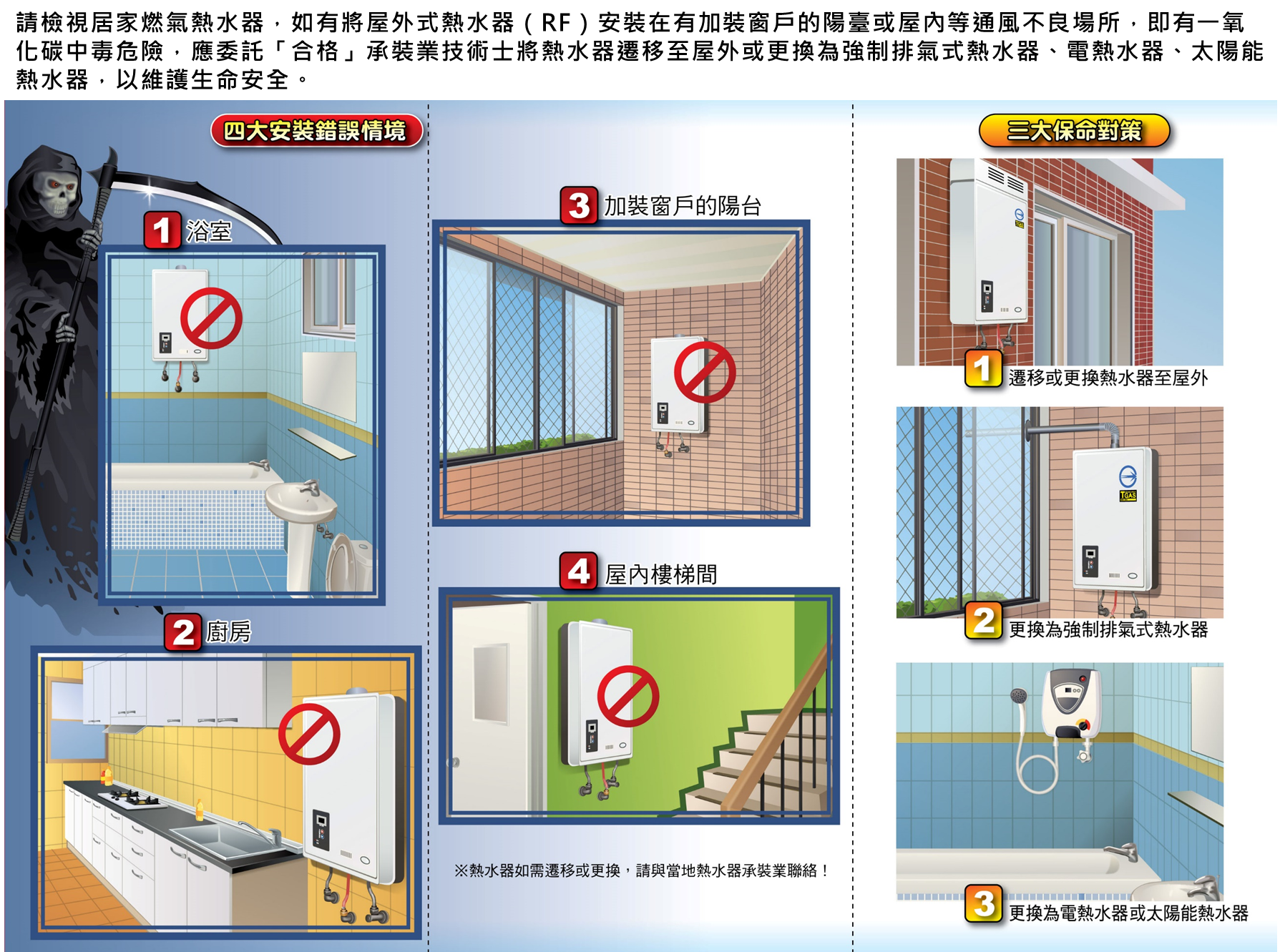 請檢視居家燃氣熱水器,如有將屋外式熱水器(RF)安裝在有加裝窗戶的陽臺或屋內等通風不良場所,即有一氧化碳中毒危險,應委託「合格」承裝業技術士將熱水器遷移至屋外或更換為強制排氣式熱水器、電熱水器、太陽能熱水器,以維護生命安全。