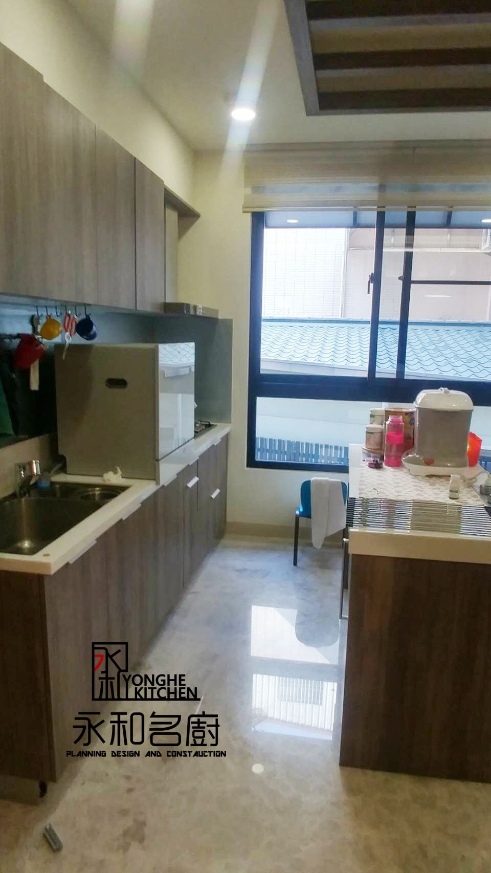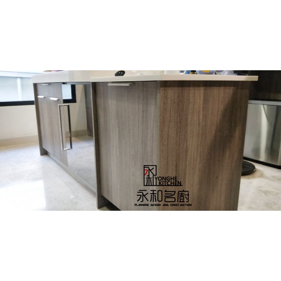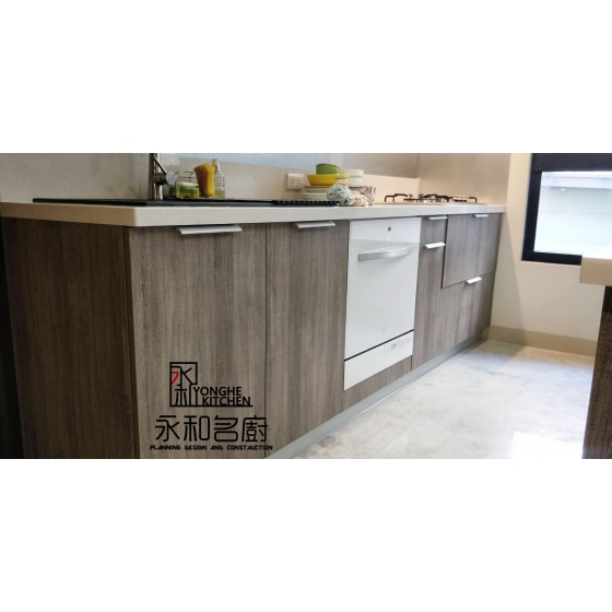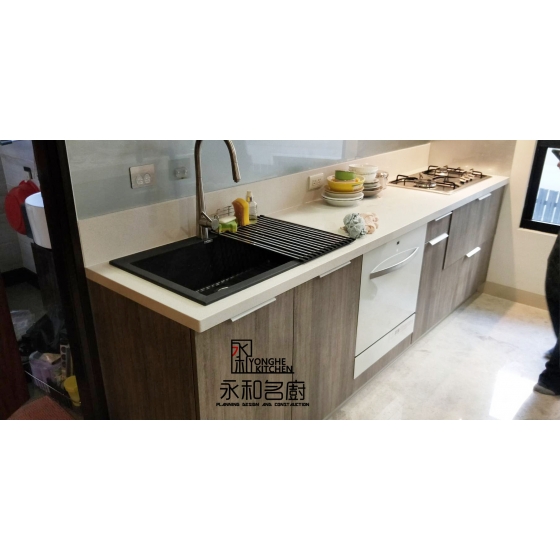 ★換新的石英石檯面,並將原本放在桌面上的洗碗機,放到櫃子裡,並將中島處原來放烘碗機的地方,改櫃子,讓收納空間更多,也讓廚具的整體感提升。